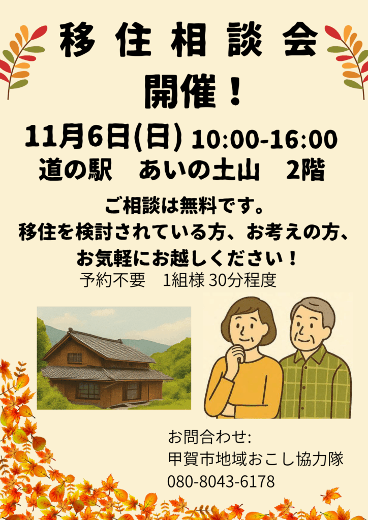 【PR】<予約不要>移住相談会開催! 2025 11/08 イベント お知らせ その他 2025年11月8日 日時:11月6日(日) 10:00-16:00場所:道の駅あいの土山 本館2F 多目的室7ご予約:不要所要時間:1組様 30分程度ご相談は無料です。移住を検討されている方、お考えの方、お気軽にお越しください! お問合わせ先:甲賀市地域おこし協力隊080-8043-6178 pdfはこちら イベント お知らせ その他 URLをコピーしました!