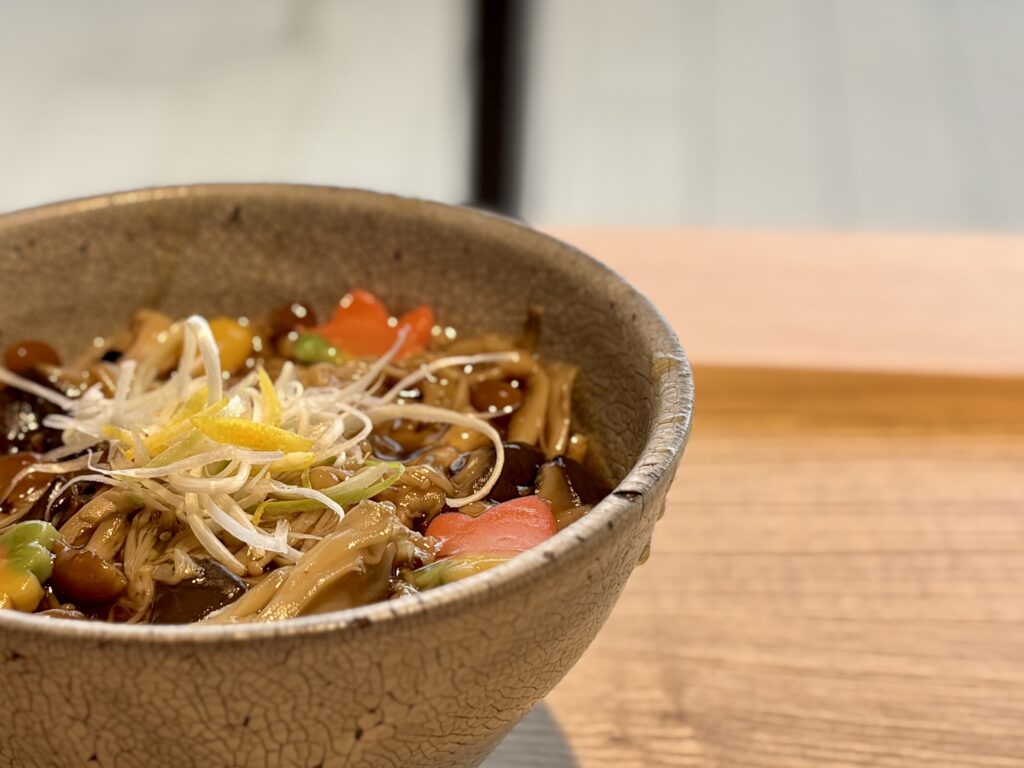 香り豊かなきのことほっこり銀杏、もみじ麩を合わせた特製あんをたっぷりかけました。