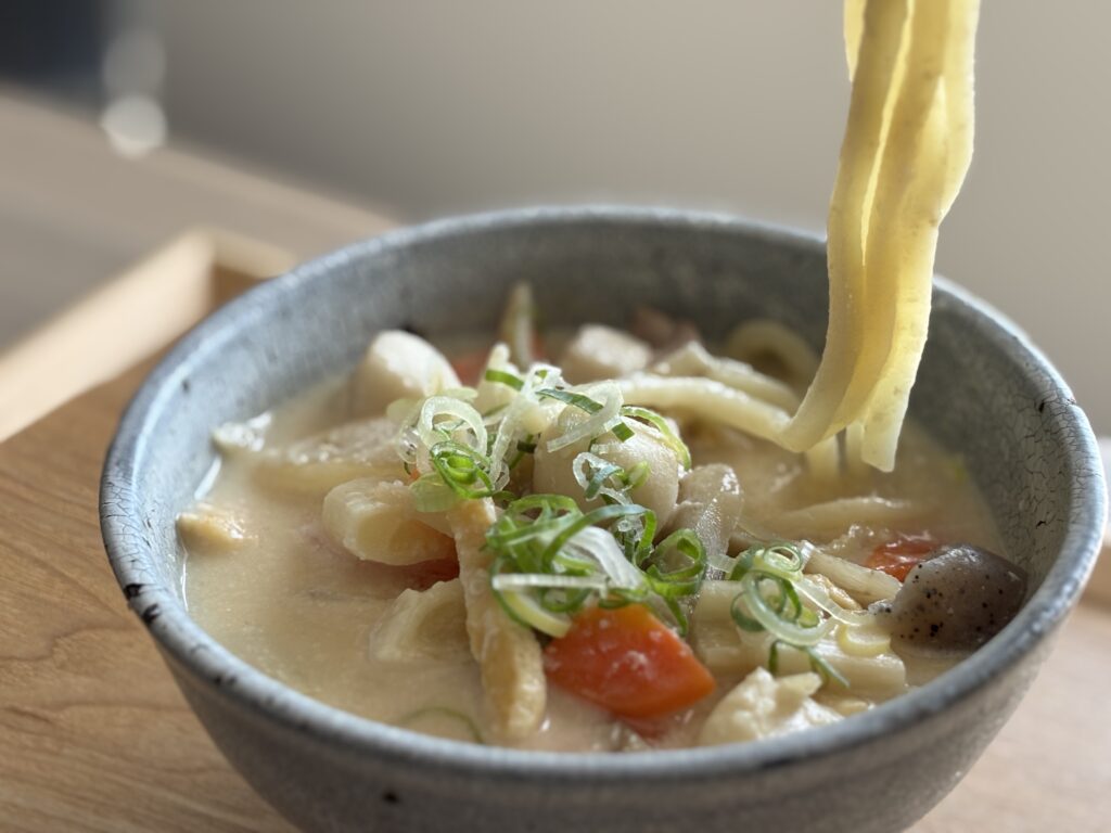 酒粕の風味がしっかり感じられる特製粕汁をうどんに合わせた一杯。