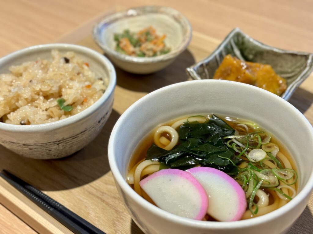 喉ごしのよい小うどんと、もちもち食感のおこわを一緒に楽しめる、満足感のある定食です。